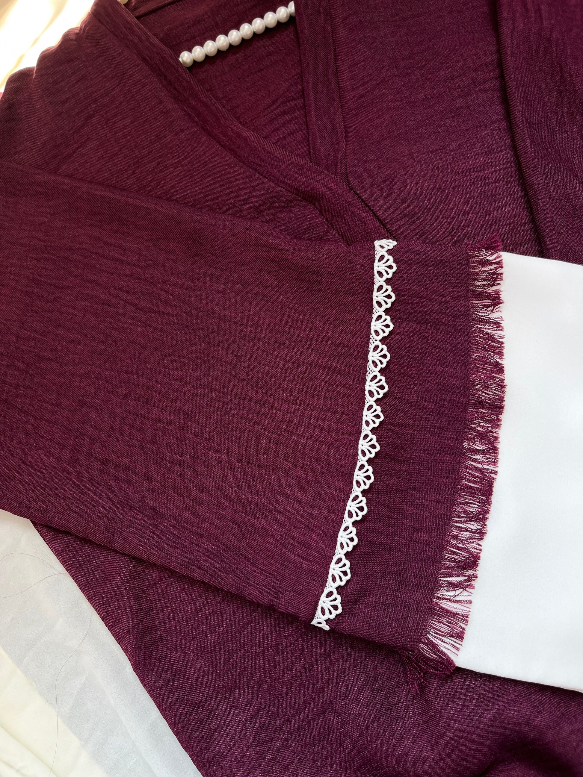 Crafted in rich maroon textured fabric, this abaya features delicate white lace and a soft contrast panel for a timeless look. Lightweight, breathable, and beautifully finished with subtle fringe, it’s perfect for summer with a graceful, modest flow ideal for both casual and semi-formal wear.